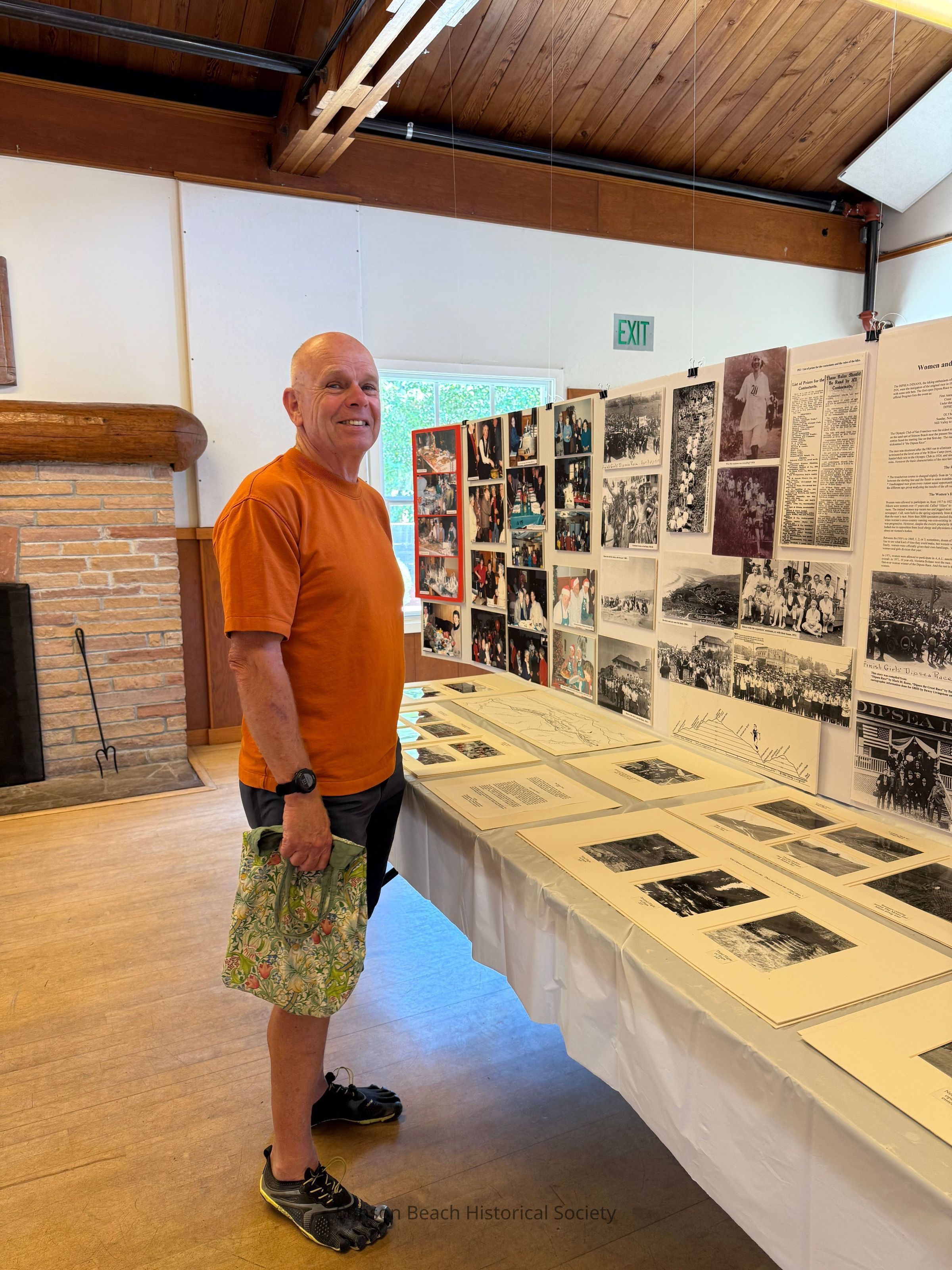 Immo Gunzerodt looking at the Dipsea Race exhibit. The race starts in Mill Valley, up 3 flights (long stairways), over Mt. Tam then down to downtown Stinson Beach. This grueling event has been going for 100 years and continues to this day. It also shows the first time women were allowed. Note the running costume of lady in white.