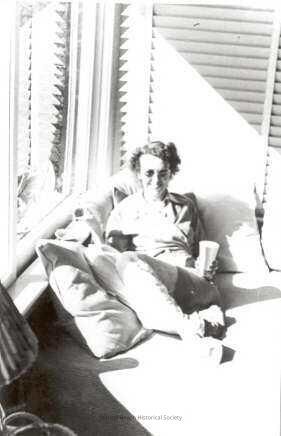 A smiling woman in dark glasses lounges against some pillows beside a window with the sun pouring in. She is casually dressed in blouse and long pants and she is holding a paper cup in one hand. Behind her are closed venetian blinds.Collection