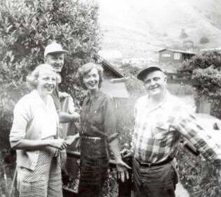 Two couples, one older and one younger stand on a porch overlooking other houses and the hillside. There is a lot of tall shrubbery. The patriarch, with one arm on the porch railing, wears a plaid shirt and cap. Across from him, his blond wife (?) is wearing a cardigan over a blouse with checked trousers. Between them is a younger couple. She is acknowledging the camera with her eyes, her smile and arm slightly outstretched. She is in jeans and shirt with sleeves rolled up. Between and slightly behind those two women is the other man. Also looking at the camera and wearing a white baseball cap.Collection