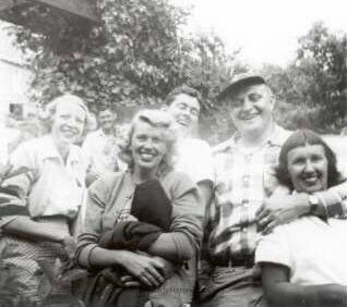 Group photo of Fischer family outdoors, presumably on the deck of their house. Smiles all around, we see (L. to R.) older-looking blond woman, smiling man in distance, happy blond in forefront cradling a jacket, young lad looking over her shoulder, proud patriarch with one arm around the neck of the lady with the bangs.Collection
