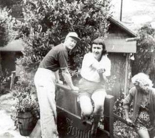 Same porch as in previous photo. Same man in baseball cap and blond woman in sweater. Here he is resting his arms on the railing and looking at the camera. The blond is on the stairs, one hand on the railing, looking over her shoulder. A second female has joined them and she is sitting on the corner of the railing beside the man. She has dark hair with bangs and is wearing shorts and a white shirt. Slightly more of the deck and the attached house is visible behind them. The house is obscured by a large leafy bush. There is also a plant in a wooden barrel on the deck near the man who is standing.Collection