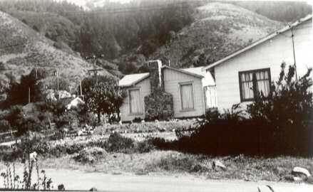 View of a small cottage sitting behind or beside another larger white frame house with one window and slanted roof visible. The cottage has 2 tall windows on either side of a stone chimney. The two houses are separated by a gardenlike area with shrubbery alongside the larger house and a small tree beside the cottage. A mountain ravine forms a backdrop. And at least one other rooftop is visible.Collection