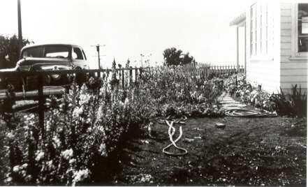 The yard beside the white house. It is fenced in - pickets on one side, wood & wire on the other. Tall blooms grow up along the fence, smaller flowering plants alongside the house. A hose is coiled by the walkway beside the house and also loosely laid on the grass in the yard. A dark automobile of the day is parked on the far side of the fence.Collection