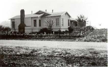 Rear view of the house at 275 Calle del Mar (the side with the stone chimney), surrounded by open fencing which separates it from a dirt road. Everything else is rather barren but grassy.Collection