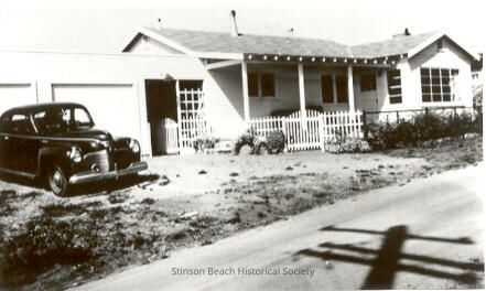 Front of the house at 275 Calle del Mar with dark sedan parked in dirt "driveway" in front of the garage that is an extension of the house. The house is an L-shaped one-story wooden house painted white with a picket gate and fencing leading to the front door. Wood and wire fencing continue on around the yard. A road runs in front of the house with the shadow of a telephone pole on it.Collection