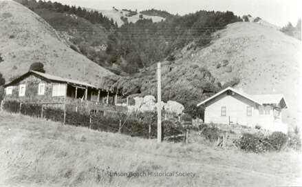 The "neighborhood" on the hill consists of two houses - a white clapboard type below and a shingled ranch-type farther up the hill. They are separated from an open field by wire fencing. A (telephone?) pole stands between them on the fieldside of the fence. The ravine on the mountain rises up behind the houses.Collection