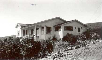 Solitary white house sits on the side of a hill. There is some shrubbery growing beside it and extending down the hill but the rest of the ground is covered with small rocks and dry grass. The house is one story with a few steps up to a narrrow covered porch that leads to the door. The porch is accented with a little gingerbread trim and has a low railing. The front and side of the house has windows on all sides, most of them small.Collection
