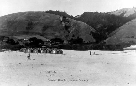 This black and white photograph shows a row of five cabins with more behind on sand dunes. They appear to be tent cabins. Part of a building (Sea Downs) is visible at the right edge of the picture. Hills rise behind the structures.Collection