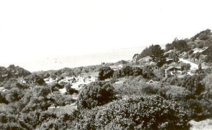 View looking down on hillside homes with the ocean in the distance. Foreground is dense with brush and trees.Collection