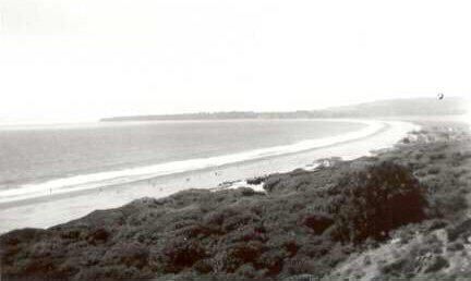 Panoramic view of Stinson Beach/Bolinas Bay looking north from high on the hillside. Some beachfront homes in the Calles are visible in the distance. Foreground is mostly thick with treetops and scrub.Collection