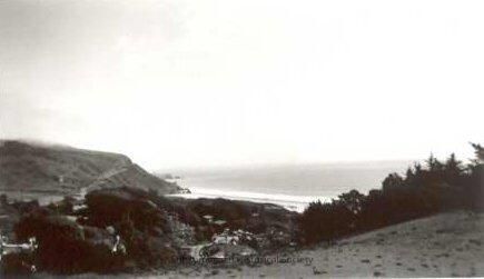 Panoramic view from high on a hill looking down into the town and out over the ocean. Looking south Shoreline Highway is visible along the cliffside on the left of the photo. Trees are silhouetted on the hill rising on the right.Collection