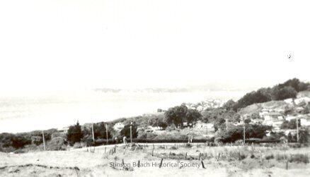 View of Stinson Beach hillside rising above Bolinas Bay. A number of homes can be seen on the hill as well as beyond in the area of the Calles and Patios. Foreground is mostlly empty grassland with a scattering of posts, probably holding up fencing. Bolinas Ridge and Point Reyes Peninsula are dimly visible in the distance.Collection