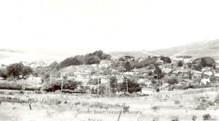 Panorama of hillside homes in Stinson Beach. View is to the north where a smidgen of Bolinas Bay is visible in the distance on the left. On the right a ridge trail is visible on the hillside.Collection