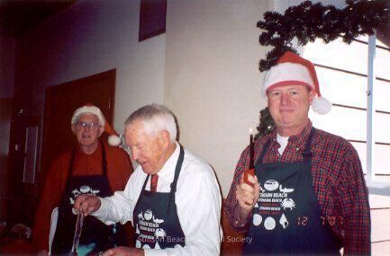 A color photograph of Parsons, Denis/Engel, Al/Fitzpatrick, Joe at 2007 SBHS Holiday Luncheon. Al is serving pre-luncheon punch. Denis is watching Al, and Joe stands with the candle lighter. All are wearing the SBHS aprons. Denis and Joe are also wearing Santa hats.Collection