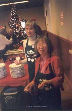 A color photograph of Fitzpatrick, Phyllis/ Agnoli, Tamae at 2007 SBHS Holiday Luncheon. They are wearing green SBHS aprons and standing in front of the food table. They are ready to help the party get started. Tamae is the chairperson of this event.Collection