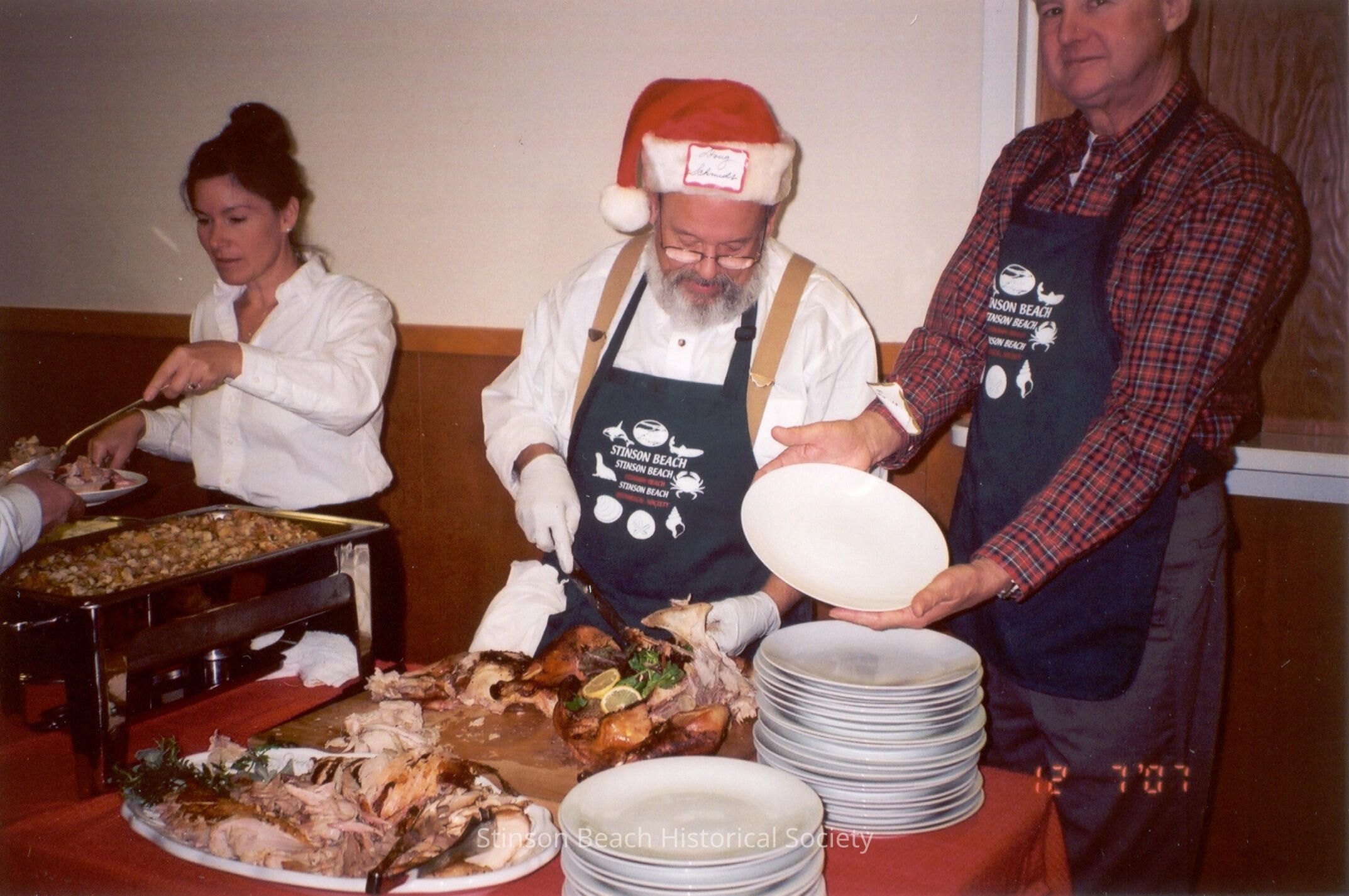 A color photograph of Douglas Schmidt at 2007 SBHS Holiday Luncheon. He is carving the turkey. He served as the chef with Denis Parson. He is wearing a white shirt and the green SBHS apron and Santa's hat. In the back on the left, a helper lady from the Willow Camp Catering; in front on the right Joe Fitzpatrick holding a plate.Collection