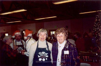 A color photograph of two women at the Holiday Luncheon. Phyllis Fitzpatrick, left, has volunteered to be an "Elf" waiter at the yearly occasion and Erma Parsons, wife of Denis, the chef. In the background, Barbara Ward, a guest is talking to Doug Schmidt, the chef, and Steve Martin, the elf waiter.Collection
