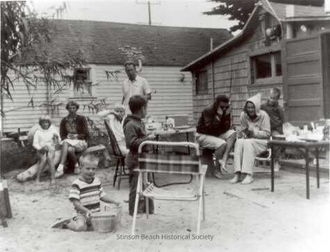 Family members gathered in the backyard of Simmons' cottage, affectionately referred to as "The Mousehole." Two young boys in the foreground - the youngest blond boy sitting in the sand with a bucket while the other is turned towards a girl in a hooded sweatshirt talking to him on the right. She is seated by a card table with food supplies on it. Another young boy with a crewcut and wearing a sweatshirt is casually sitting on the back of the chair behind her. Next to her is a barefoot fellow in dark glasses holding the collar of his windbreaker around his neck. On the left seated on a driftwood bench is a short-haired woman in a cardigan and skirt with clasped hands, and a young blond girl(?) sitting next to her, looking straight ahead. In the center stands a tall man in short-sleeved shirt looking at the kids. Another blond boy is seated in front of him beside another card table with food supplies.Collection