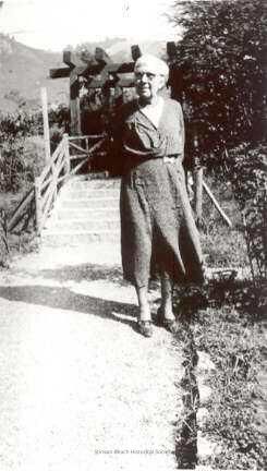 A white haired woman (Mabel Lawrence) stands on a pathway, steps behind her leading to a wood-beamed veranda beside dense foliage. She is wearing a housedress that has a V-neck and glasses. Her hands are behind her back. She is not smiling but has a slightly bemused look. The rolling hills of the mountain are visible in the background.Collection