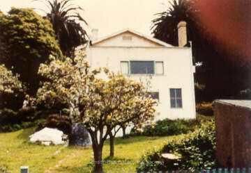 Rear view of a white 2-story house and lawn area with two flowering trees and low shrubs. There are larger trees, including a palm on the far side of the house. The house has one long window on the upper floor. Only one smaller window is visible beneath it, the other window(s) are obscured by the flowering trees. This is the Lawrence family home which is located on Shoreline Highway north of Barbara Chevalier's residence.Collection