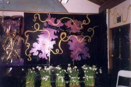 This color photograph is of a smashing painted backdrop with five paperwhite narcissus plants in full bloom standing in front of it. The backdrop is of amorphous purple cloudlike shapes with gold ribbons twining about them.Collection