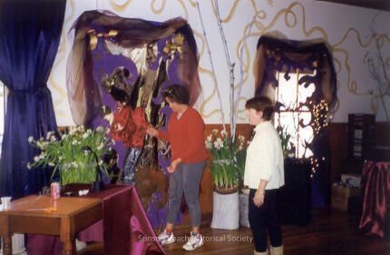 In this color photograph two women (left to right Belinda Zell and Lesley Robinson) are working on the decorations for the Millenium Party. Belinda, in a red sweater, is holding a piece of saran wrap. She is standing in front a faux window made of aluminum foil draped with filmy material. Lesley is watching Belinda. The walls are painted with gold scrollwork. A planter box of paperwhite narcissus stands on a nearby table along with a cola can and a pair of scissors.Collection