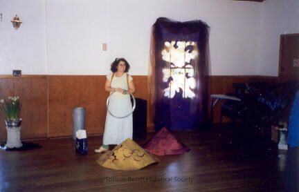 In this color photograph a woman (Heidi Gross Sandeval) in a long white skirt and off-white top, stands holding a hoop in her hand. There are two decorative, cone-shaped lamp shades, one gold and one raspberry, on the floor in front of her. The hoop is probably the framework for a third one. These cones are to be hung, inverted, under the ceiling lights (see 2000-212-01, upper left corner). To the right of Heidi is a draped and decorated door. The walls are bare.Collection