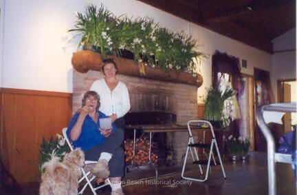 In this color photograph a woman in a blue shirt (Peggy Larson) sits on a chair facing the camera. She is eating something from a plastic tub which she holds in her hand. A woman in a white shirt (Tess Greene) is standing behind Peggy. The fireplace is behind them. There are red lights in the fireplace and the mantel is covered with paperwhite narcissus. There is a folding table and a step ladder in front of the fireplace.Collection