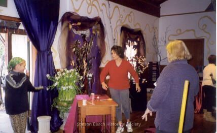 In this color photograph a young girl (Belinda Zell's youngest daughter, Alice) with a green scarf on her head is facing a woman in a red sweater (Belina Zell). Also facing Belinda, with her back to the camera, is a blonde woman in a blue shirt. The walls are decorated with gold, painted ribbons and there are rich fabrics draped around doors and windows and faux windows. There is a small table in front of Belinda with string and scissors on it among other things.Collection
