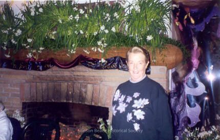 In this color photograph a woman (Mimi Lowery) stands smiling in front of the fireplace. Paper white Narcissus decorate the mantel and there are red lights in the hearth. Mimi is wearing a blue sweatshrt with white flowers on it..Collection