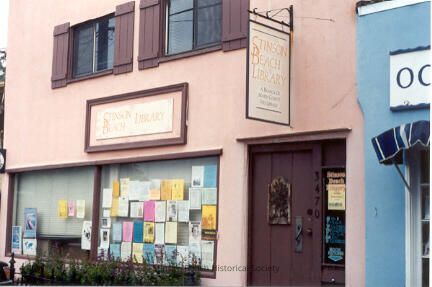This color photograph is a close up of the library building described in #2000-238A-01. It is close enough so that the writing on the signs is readable (the lettering is rust colored and does not stand out from a distance).Collection