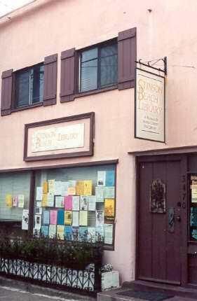 This is another view of the library building described in #2000-238 A-01. It is taken from a closer angle and does not include the neighboring structures. This view shows a second sign reading' Stinson Beach Library' which hangs at right angles to the building front.Collection