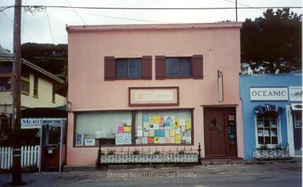 This color photograph is of a pink store front which was the Stinson Beach Library. The shades are down on the two large front windows and multiple colored notices are displayed on them. To the right of the display windows is a brown door and there are two windows in the upper story with matching brown shutters. There is a sign reading 'Stinson Beach Library' between the upper and lower windows. There is an iron work planter box stretching across the front of the building. A phone booth stands against the building on the left. A blue building abutting the library on the right is partially visible. It has a multiple paned window with a blue striped awning over it and an ironwork planter box below it. A sign reading 'OCEANIC' is above the window. The building is Oceanic Realty.Collection