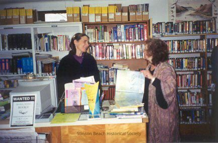 Inside the old library, Kerry stands behind her desk looking at Susan Tacherra. Susan is standing beside the desk holding a map and looking at Kerry. The shelves behind them are filled with books. On Kerry's desk is a computer monitor, numerous informational materials (plus a Wanted sign for books) and a small pile of books on the corner. There is also a nature print on the wall over one bookshelf.Collection