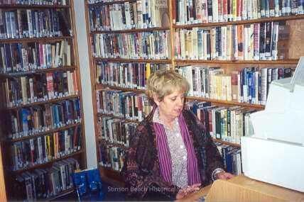A blond woman (Katherine Treffinger) sits in a corner of the library in front of a table that has what looks like a computer printer on it. She is wearing a black & white blouse under a dark patchwork print velvet-looking jacket. The shelves behind her are packed with books.Collection