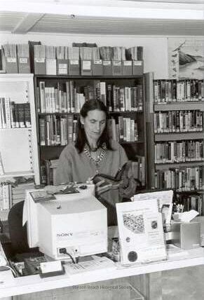 Kerry Livingston, Stinson Beach Librarian, stands behind her desk looking at an open book. Behind her are shelves full of books. On her desk is a computer monitor as well as a plastic display stand containing County of Marin informational material on "Preparing for the Year 2000."Collection