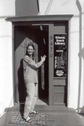 Kerry Livingston stands in front of the open doorway to the Library. She has one arm slightly raised and is slightly turned as if about to go in. She is wearing a long-sleeve cotton shirt and long pants and sandals. One the door frame is the address (3470) and on the narrow window to the right of it are painted the library hours. Beneath this is the book return slot, which has a lift-up door.Collection