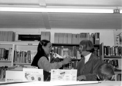 In this black and white photograph two women are facing each other and smiling. They are Kerry Livingston (Librarian) on the left and Jane Slack on the right. Kerry, with long dark hair and wearing a dark vest, is holding a plant in one hand and reaching toward Jane with the other. Jane has lighter hair, short and in a straight cut, and is wearing a light turtleneck under a darker shirt. There are computers in front of them and shelves of books behind them. The back of a boy's head is in the right lower corner of the photo.Collection