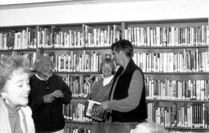 Four people are in this black and white photograph. There is a woman (Sally Veauta) in the left hand lower corner. She is closer to the camera than the others and a little out of focus. Next to her is her husband Garry. He has a fringe of white hair and a white goatee. He wears a dark sweater. Third from the left is a smiling woman with short hair and glasses. She is Jane Slack. On the right is a tall, dark haired man wearing a dark vest over a lighter shirt and holding a book. He is Tim Dawson. The background is a wall of books.Collection