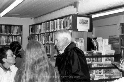 In this black and white photo three people stand in the library talking. The woman in the middle is unidentified. She has her back to the camera and has long blonde hair. The man on the right, in profile is Al Engel. The woman on the left, also in profile, with short dark hair and glasses, is Andrea Riesenfeld. There are shelves of books and a magazine rack in the background. See notes.Collection