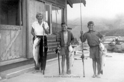 In this black and white photograph a woman and two boys stand on a cement patio by a log house with a dutch door. The three of them are holding fishing poles and large fish. The fish are striped bass and range in size from about 18 inches to 26 inches long. The people are, from left to right, Adelaide, Mark and Craig.Collection