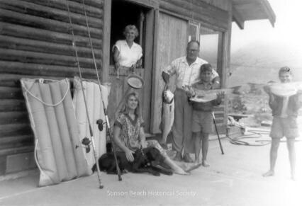 In this black and white photograph the whole family poses beside their house. A girl (Jan) in a print dress and long blonde hair sits on the ground with a black lab beside her. Behind her, looking out of the top half of a Dutch door is a woman (Adelaide) with short blonde hair and wearing a white blouse. She is smiling and holding a skillet and a spatula. To the right a man ("Sundown" Roland) stands with his hand on the shoulder of a boy (Mark) who stands in front of him. He holds a big fish (striped bass) in his other hand and the boy is holding a big fish horizontally in his arms. At the right side of the photo there is another boy (Craig) holding yet another fish horizontally up by his chin. There are two rubber rafts and two fishing poles leaning against the house.Collection