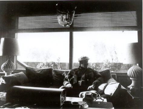 Kendrick Rand sits on a sofa in front of a picture window in the home of George & Albertine White. Two large table lamps are arranged on either side of the couch. A coffee table in front of the couch holds a telephone, a cup and saucer, 2 mugs and a strong box. Kendrick is wearing a billed cap, down parka and smoking a cigarette.Collection