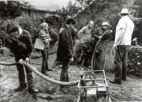 Outside of the White residence are assembled (L to R) Kenny Stevens, Barbara Alban, Mike Bagley, Bruce Wachtell, Kendrick Rand and George Flynn (seen from the rear only). Kenny and Kendrick are working each end of the hose attached to a sump pump as the others look on. They are in the garden patio area of the house where there are many plantings and tree branches. The apartment complex can be seen on the far side.Collection