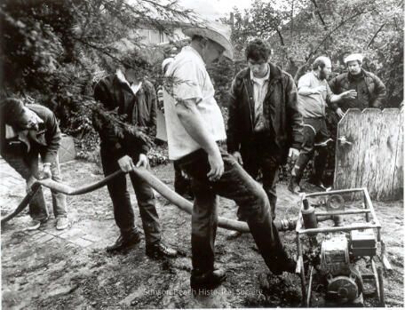 The clean-up crew (L to R, John Washington, Kenny Stevens, George Flynn, Mike Bagley, Bruce Wachtell and Kendrick Rand), still in the patio of the Col. White's house. George Flynn, in cowboy hat, primes the pump with his foot while Mike looks on. To their left, John and Kenny hold the hose from the pump off the ground. In the background Bruce, in waders and a work shirt, explains the problem with his hands to Kendrick, who stands with arms akimbo behind a waist-high wooden enclosure.Collection
