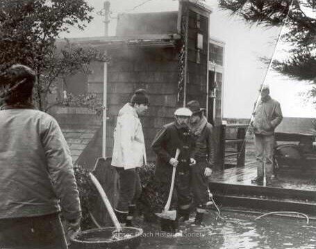 On the deck of the White residence where the water is ankle deep stands Kendrick Rand holding an axe. There are four other men there also. In a rain slicker and wool cap, Terry Swift stands to the left of Kendrick. A person in a western hat is behind him and a man in a cap with his hands in the pockets of his jacket stands on the upper deck watching. The other person in the left hand corner can only be seen from the rear.Collection