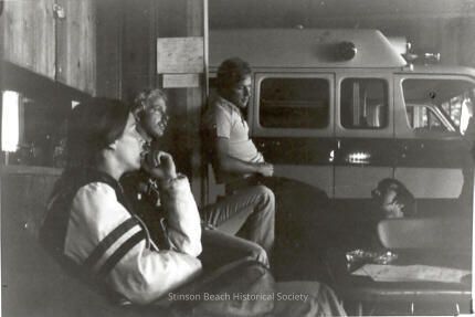 Inside the firehouse are seated in profile to the camera (L to R) are Karen Garrett, Bob Boyce and John Evans. There is a 4th person wearing glasses sitting on the floor looking up at them but he is unidentified. An ambulance is parked behind them.Collection