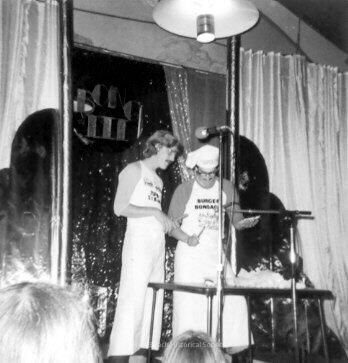 In this black and white picture two men are on the stage. The man on the right wears a chef's hat, a tank top and an ankle length apron wrapped around his waist. He is cooking or pretending to cook something. His tank top has printing on it. The top word is BURGER. The bottom word is partially obscured. The letters that are visible are BONGA (possible Bongalo?). The man on the left appears to be the assistant. He wears the tank top and long apron but no chef's hat. The writing on his tank top is unreadable in this photo. Two backs of heads of audience members are visible at the bottom of the picture.Collection