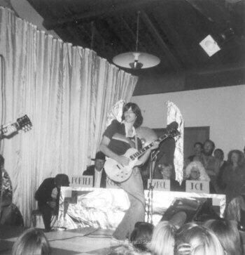 In this black and white picture a young man is standing on stage, playing an electric guitar. He is looking to his right toward another guitar player whose hand on the neck of the guitar is just visible on the left side of the photograph. There are other band members behind the guitarist sitting at music stands. Audience members are seen standing against the wall behind the band and sitting (backs of heads only) in the foreground.Collection
