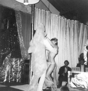 In this black and white photograph a couple dances on the stage. She is in a very skimpy harem girl outfit with lots of leg and torso bared. He is in a big fish costume which rises about two feet above her head. Perhaps her costume is a mermaid. There is something that looks like a fish tail down by her ankles.Collection